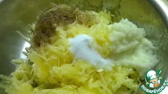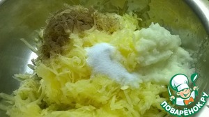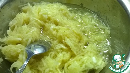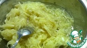 Трем кабачок на крупной терке. К нему добавляем соль, измельченный лук и черный душистый перец. Хорошо перемешать.
