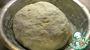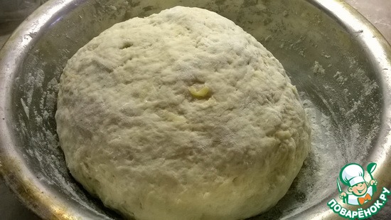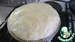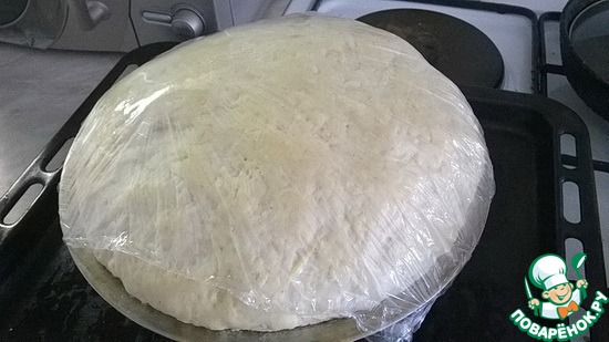 После начинаем добавлять муку, смешанную с дрожжами. Замесить тесто, использую остатки растительного масла. Накрыть пищевой пленкой, поставить в теплое место для подъема.