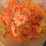 Следующий ингредиент - креветки, либо кальмары или крабовые палочки. Из собственного опыта - крабовые палочки ничуть не проигрывают натуральным морепродуктам. Нарезаем также соломкой.