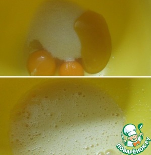 Яйца соединить в миске с сахаром и мёдом. Хорошо взбить.