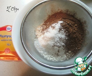 В отдельную посуду просеять и смешать муку, какао и разрыхлитель теста.