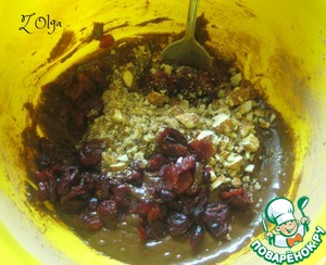 В яично-сахарно-медовую смесь добавляем половину мучной смеси, слегка измельченные орехи, клюкву. Хорошо перемешиваем. Добавляем оставшуюся муку.