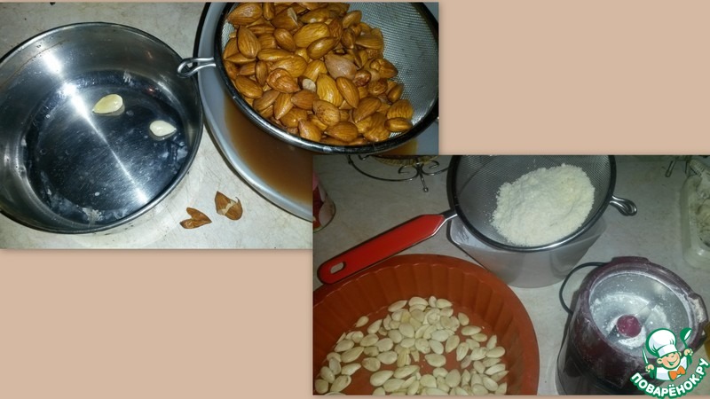 Если у Вас нет готовой миндальной муки, не расстраивайтесь. Ее с легкостью можно приготовить дома. Для этого берем не очищенный, не обжаренный миндаль (немного больше, чем требуется уже готовой муки) и заливаем кипятком на пол часа. Затем, с легкостью снимаем с него шкурку и убираем в духовку на 100град. просушиться в течении минут 20. Дать остыть. В этот момент-следите за близкими. Мною замечены факты воровства продуктов со столов уже на этом этапе)))