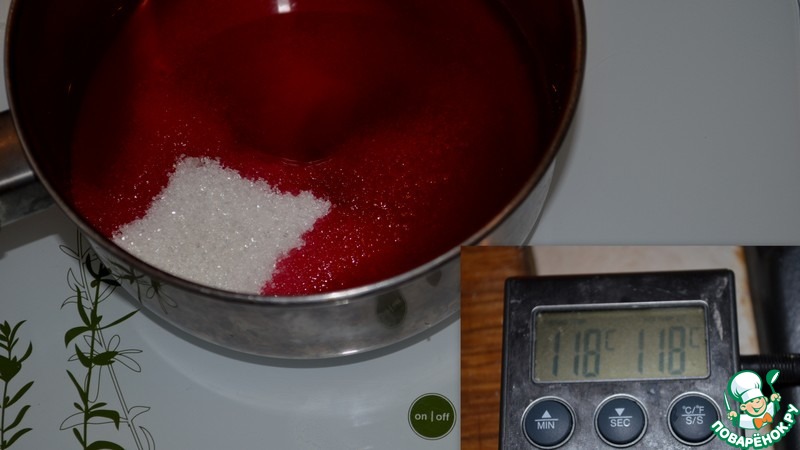 В это время сахар 150г. нагреваем с 50г. воды. Также можете добавить жидкий краситель. Но, чтобы жидкости в итоге было не более 50г. Если краситель сухой-его можно будет добавить уже в готовое тесто, получатся разные по цвету макарон из одного теста. У меня красители пока есть только жидкие, поэтому, добавляю в сироп. Итак, сахар с водой и красителем ставим на медленный огонь. Доводим до 118град. Вот при этой температуре сироп вливается в белки. После закипания до 118град. сироп у меня нагревался на медленном огне примерно 10 минут. Но лучше-купите все же термометр для приготовления пищи. Он стоит не дорого, а пригодится на кухне не только при приготовлении макарон.