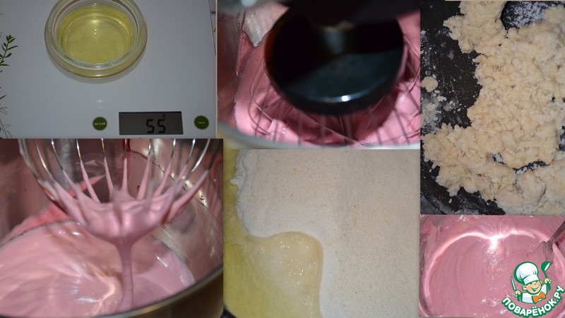 Отмеряем белки 2 раза по 55грамм. Первые 55 грамм начинаем взбивать миксером в тот момент, когда сахарный сироп достигнет температуры 95град. Взбиваем до пенки. После того, как сироп достигнет температуры 118град, тонкой струйкой вливаем его в белки. Продолжаем взбивать до того момента, как белки станут прохладными. В этот же момент оставшиеся 55грамм белка добавляем к миндальной муке с сахарной пудрой, перемешайте (вилкой, ложкой-чем удобнее, не надо взбивать). Не очень тщательно, не до однородной массы. Так как она может схватиться очень быстро и будет камень.