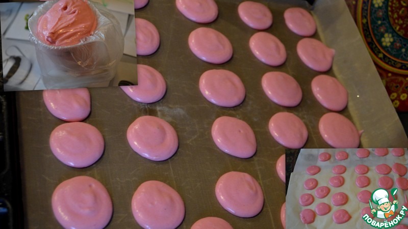 Перекладываем тесто на кондитерский мешок с круглой насадкой около 1см. и отсаживаемм на подготовленный лист (не смазываем ничем) пергамента, тефлоновый или силиконовый коврик. Выдавливаем плюшками диаметром 3-4 см. Лучше заранее нарисовать кружки с внешней стороны листочка. Учитывайте. что белковое тесто немного увеличится в размере, чтобы плюшки не слиплись друг с другом. Затем оставляем бумагу с заготовками при комнатной температуре на 30 мин-2 часа для образования на заготовках тонкой корочки. Этот шаг очень важен, после него как раз и формируется свойственная для макарон "ножка".