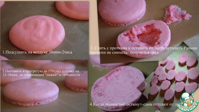 Пирожное, на котором образовалась тонкая корочка будет выглядеть матовым. После подсушки, ставим противень с макарон в нагретую до 150град. духовку на 12-18минут. За это время образуется "ножка" и макарон приготовится. Не надо держать долго, чтобы не образовались безе.
