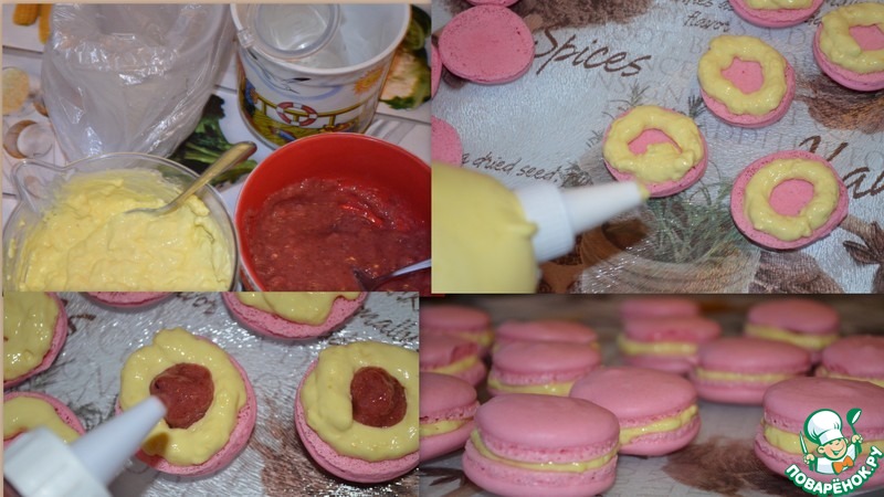 Остывшие заготовки подберем по размеру. Два вида крема вынем из холодильника и поместим в кондитерские мешки. Лимонным кремом со сливками делаем колечко по краешку макарон. А клубничный-капаем капелькой внутрь. Скрепляем пирожное и убираем в холодильник на сутки. Остается только нервно ждать, когда крем немного размягчит внутренность макарон. И получится чудесное лакомство.