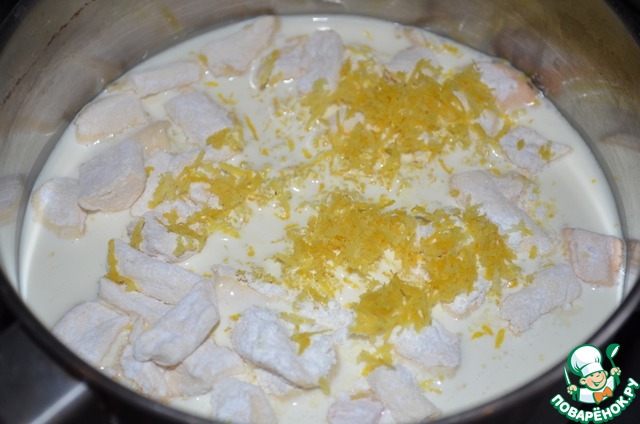 Сливки нагреваем, добавляем натертую цедру одного лимона, маршмелоу, сахар и набухший желатин 1-1,5 листочка. Прогреть. Уберите в холодильник, минимум на 12ч. Я приготовила маршмелоу в домашних условиях -затраты по деньгам только на сахар желатин, зато из 500г. сахара выходит почти 3 литра готового нежнейшего маршмелоу.