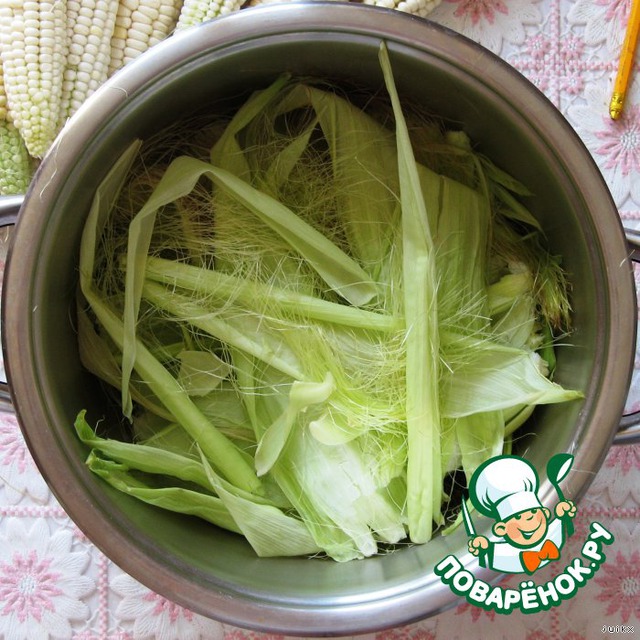 • Кукурузу чистим, но не до конца, а оставляем по нескольку листов на каждом початке. Это как раз те листики и чубчики, которые используются в дальнейшем при варке.