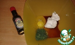 • В миску разбить яйцо, добавить сметану, соевый соус, мелко нарезанный укроп