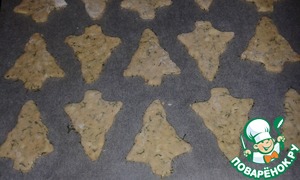 • Раскатать тесто толщиной около 5 мм и вырезать фигурки. Уложить на противень застеленный пергаментом