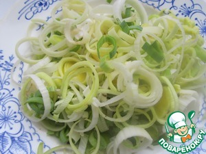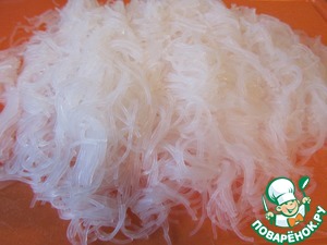 Фунчозу залить кипятком на 8-10 минут. Воду слить, фунчозу на доске измельчить ножом, чтобы она не была слишком длиной.