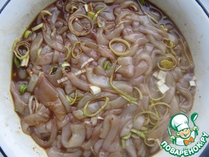 Перемешать кальмары с луком и залить маринадом на 20-30 минут.