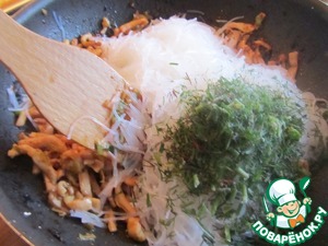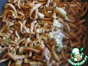 В готовые кальмары выложить фунчозу и зелень укропа. Все хорошо перемешать и выключить огонь.