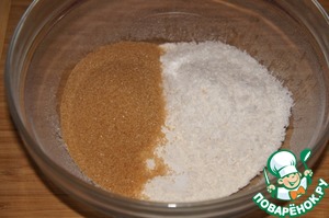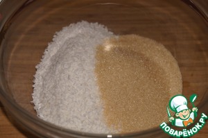 Оставшуюся кокосовую стружку соединить с мелким коричневым сахаром, перемешать.