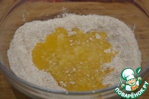 Добавить растопленное масло и перетереть руками до получения однородной крошки.