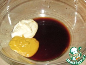 В миске смешать соевый соус (у меня сладкий, если вы используете обычный, то добавьте 1/3 ч. л. сахара), белое вино, горчицу и майонез. Хорошо перемешать -