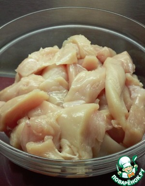 • Куриное филе режем на небольшие прямоугольники или кубиками со сторонами около 2-3 см. Форма нарезки зависит исключительно от ваших пожеланий. Солим, перчим. При возможности оставьте куриное филе после этого помариноваться – или на пару часов в холодильнике или на 30-40 минут просто на кухне.