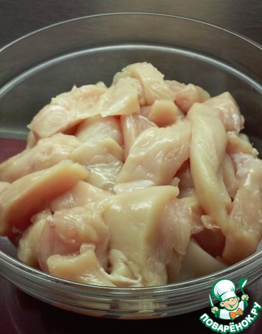 Куриное филе режем на небольшие прямоугольники или кубиками со сторонами около 2-3 см. Форма нарезки зависит исключительно от ваших пожеланий. Солим, перчим. При возможности оставьте куриное филе после этого помариноваться – или на пару часов в холодильнике или на 30-40 минут просто на кухне.
