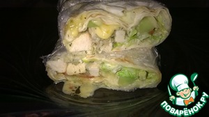 Берем лист лаваша, смазываем его соусом. Кладем капустку на нее выкладываем нашу курочку с лучком и бульенчиком, затем помидорчики и огурчики и посыпаем все это сыром. Сворачиваем.