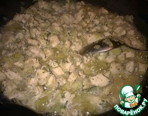 Добавляем в него порезанную небольшими кусочками куриную грудку и укропчик. У меня был замороженый. Солим и перчим по вкусу.