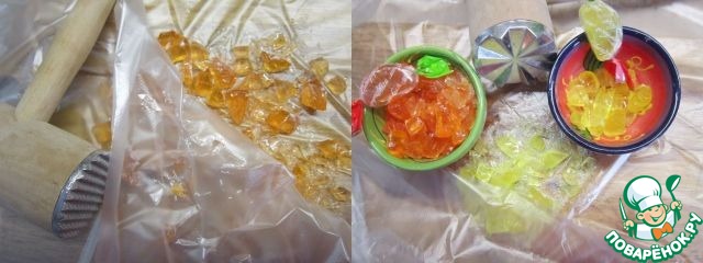 Пока духовка нагревается, а вырезанные детали домика ждут на противне, нужно измельчить (на несколько кусочков) леденцы.