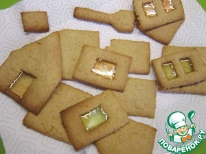 В проемы окошек насыпаем леценцовые кусочки и опять ставим в духовку, чтобы леденцы расплавились и образовали застекленные оконца.