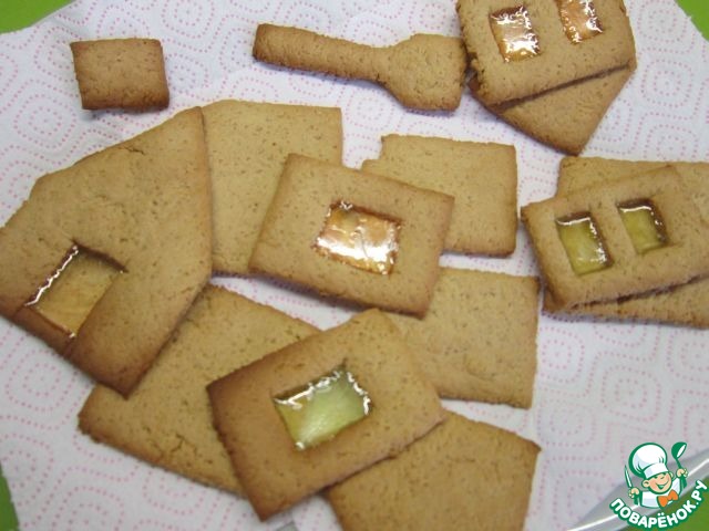 После духовки печенькам дать остыть, чтоб леденцы затвердели и только после этого снять с противня и покрыть глазурью (100гр сахарной пудры+