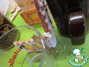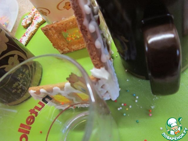 Собирая домик, для упора можно использовать разные баночки или кружки. Стыки снеток залить глазурью и дать подсохнуть.