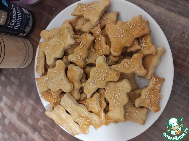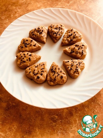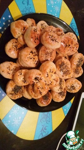 Вырезать с помощью формочек звездочки (треугольнички, квадратики, кружки). Выложить их на противень с пекарской бумагой. Промазать желтком и сверху посыпать чёрным тмином. Ставим в разогретую духовку (170 градусов) на 25-30 минут.