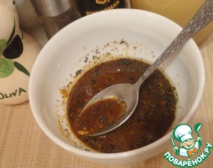 Готовим второй маринад. Соединяем соевый соус, мед, горчицу, свежемолотый черный перец, растительное масло, бальзамический уксус, оборванные с тимьяна листочки.