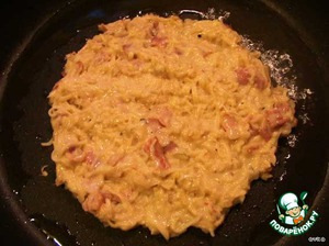 На разогретую с маслом сковороду выкладываем половину картофельного теста и разравниваем, чтобы получилась большая круглая лепёшка. То же самое проделываем с оставшимся тестом на другой сковороде.