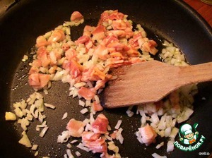 6 минут жарим в разогретом масле мелко нарезанные лук и бекон, пока лук не станет мягким и не начнёт менять цвет. Дать остыть.