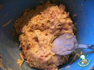 Отжатый картофель перекладываем в глубокую посуду, добавляем лук с беконом, муку, слегка взбитое (с помощью вилки) яйцо, соль и перец. Тщательно перемешиваем и оставляем.