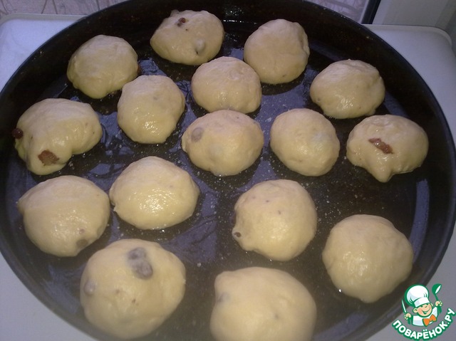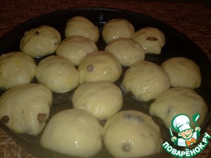 Противень смазать растительным маслом. Тесто разделить на небольшие (чуть больше куриного яйца) шарики и разложить их на расстоянии друг от друга.