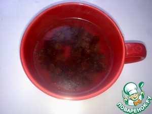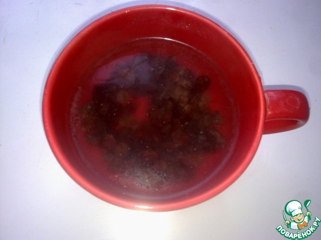 Изюм промыть, залить кипятком до набухания, затем воду слить.