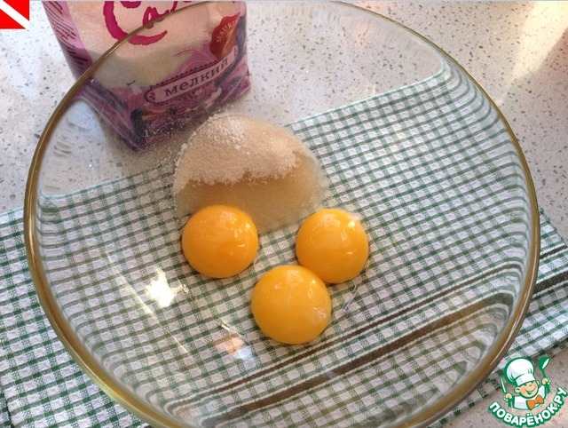 Добела взбиваем смесь воды, желтков и сахара.