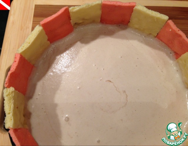 Остывший банановый бисквит разрезаем на 2 части, одну укладываем на дно разъемной формы. Форму (22 см) не смыкаем. Полосочки цветного бисквита расставляем поочередно и аккуратно закрываем форму - все зазоры между ними сомкнутся.