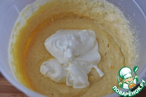 Кладём просеянную с разрыхлителем муку, всё перемешиваем.