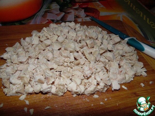 3 слой: нарезаем кубиками отварные яйца, выкладываем в салатницу и слегка поливаем майонезом