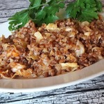На приготовление этой вкусности натолкнул традиционный греческий рецепт - лаханоризо. Такое необычное название – просто комбинация греческих слов «капуста» и «рис». А сам рецепт - вариация на тему тушёной капусты с крупой, которую издавна делают у нас в качестве начинки для пирожков или зраз. Непонятно, почему блюдо стало греческим. Точно так же, как непонятно, почему гречку у нас называют гречкой, хотя родом гречиха то ли из Сибири, то ли из Юго-Восточной Азии, и две тысячи лет назад уже была любимой растительной культурой у славян. Но, тем не менее, блюдо вкусное, сытное, очень полезное и простое в приготовлении.