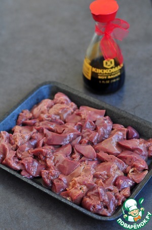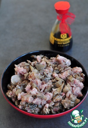 Печень помыть, обсушить, срезать пленки и жир, нарезать крупно (или мелко, как вам больше нравится), добавить к грибам, слегка обжарить, добавить 1 ст. л. соевого соуса. Посолить и поперчить по вкусу.