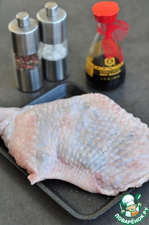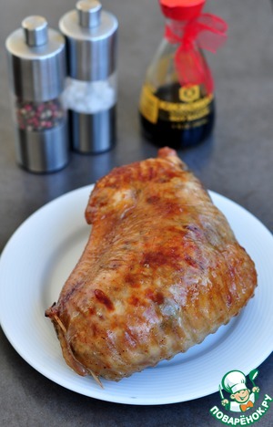 Спустя 40 минут снять фольгу, смазать крыло оливковым маслом и соевым соусом, снизить температуру до 180* и запекать еще 40 минут.