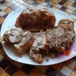 Еще одна интересная и бюджетная идея а-ля ветчины для праздничного стола. Ее так же можно приготовить накануне праздника а в день подачи останется только нарезать. Если не очень любите печень, замените ее куриными бедрами.