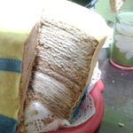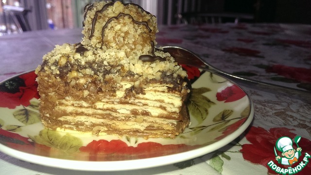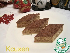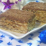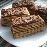 • На горячий корж выкладываем полную столовую ложку крема и равномерно распределяем. Процесс буквально конвейерный-один корж печётся, второй раскатывается, третий смазывается кремом. Самый верхний корж обильно покрываем кремом и оставляем будущие пирожные на пару часов для пропитки при комнатной t. Затем убираем в холодильник что б хорошо застыл ( я убирала на ночь).