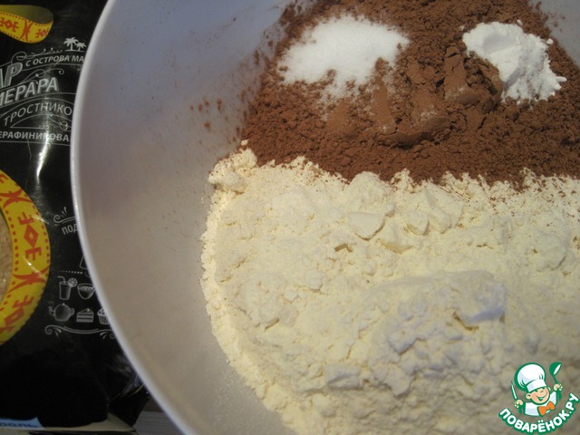 • Духовку сразу включаем на разгорев t 200 градусов. В одной посуде смешаем соль, муку, какао-порошок и соду.