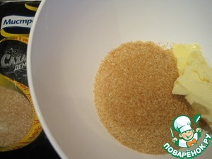 • В другой посуде взбиваем коричневый сахар и размягчённое сливочное масло.