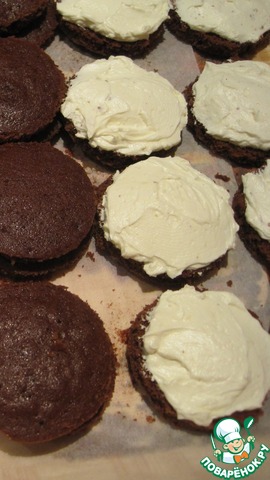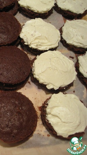 • Из данного количества теста у меня получилось 32 заготовки, на 16-ть из них я толстым слоем нанесла крем и накрыла оставшимися заготовками, слегка прижав, что б крем ровно распределился.