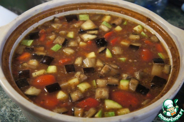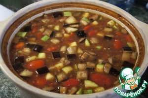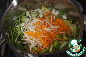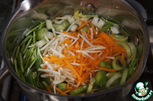 Сварить овощной бульон, процедить. Бульона может понадобиться немного больше одного литра, это зависит от размера овощей.